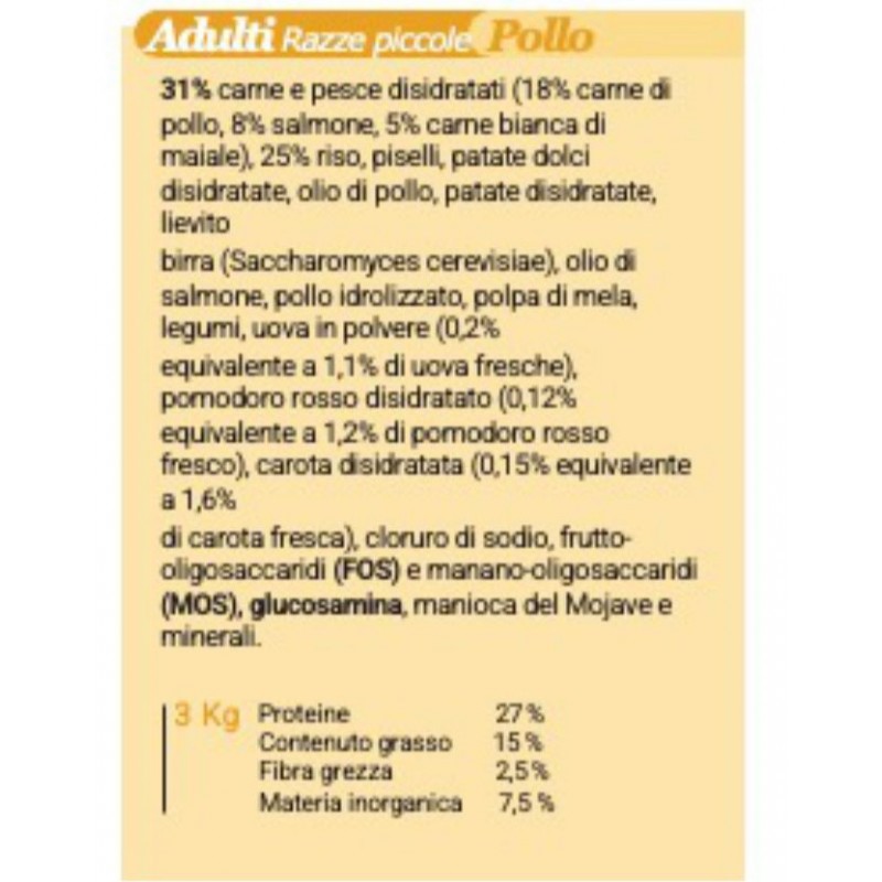 Ma non è solo ciò che contiene che rende Meu Adulti per Razze Piccole al Pollo così speciale; è anche ciò che non contiene. Questo cibo è privo di coloranti artificiali, aromi e conservanti, offrendo al tuo cane un pasto naturale e salutare. Ogni boccone è pieno di amore e cura, garantendo al tuo fedele amico una dieta equilibrata e deliziosa.